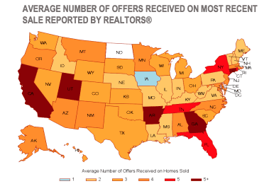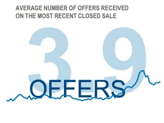 Graph showing the increase of average offers home sellers receive before closing. Text reading average number of offers received on the most recent closed sale, 3.9 offers.