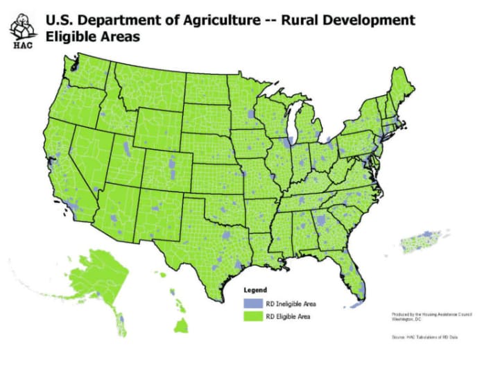 When most folks think of rural areas, they think farms and undeveloped land. However, the USDA eligibility map illustrates that most areas outside of the major cities are considered a rural area.